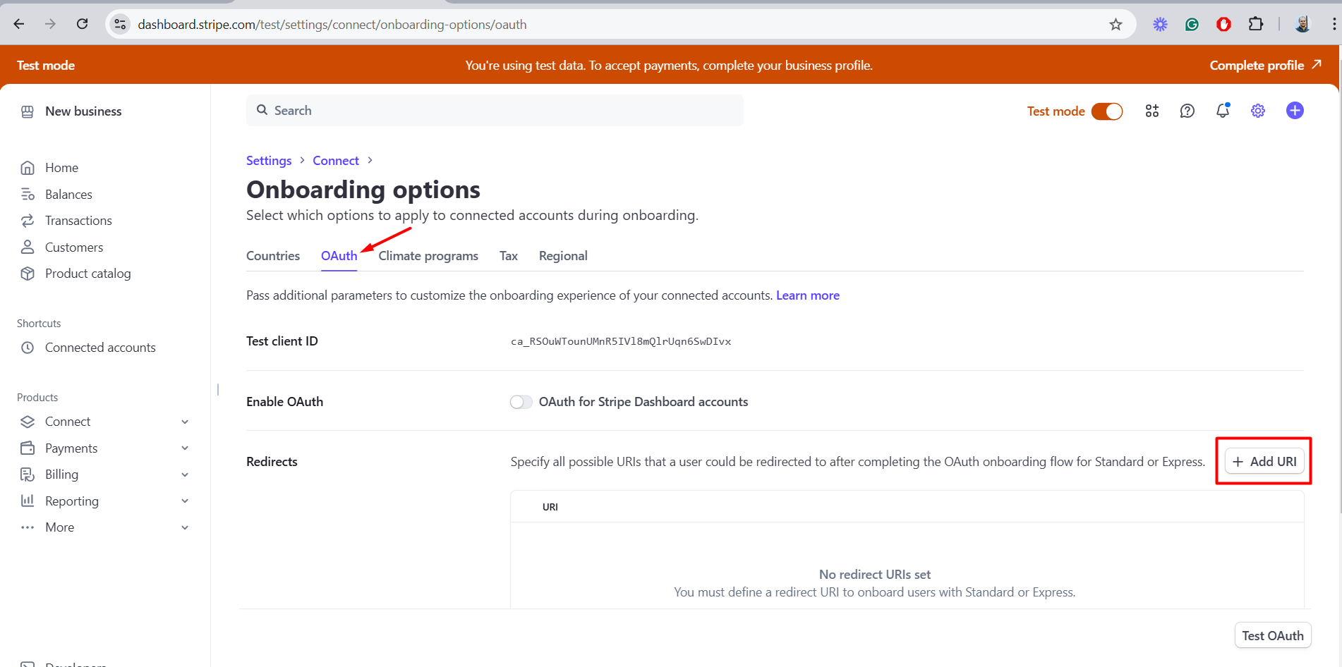 Namely, to set the link for Stripe Auth within the Connect settings.