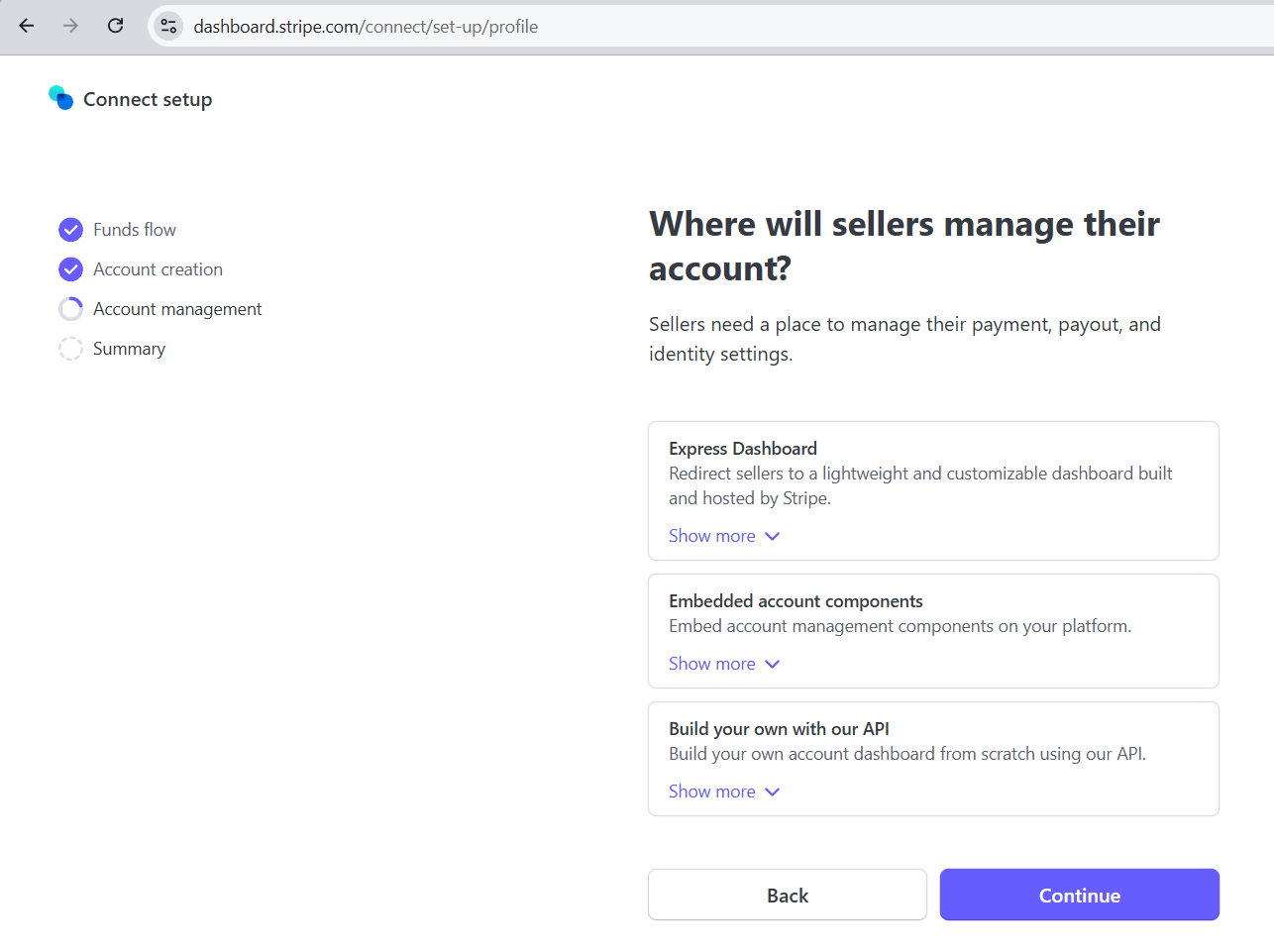 g. On the tab “Where the sellers will manage their account”, select the first option “Express Dashboard”: