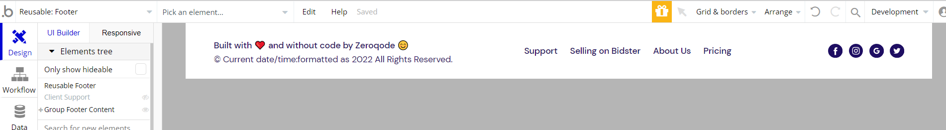 The footer reusable element is located at the bottom of a page. It provides an example of how it can include external links, such as company's social media, navigation and copyright notices.