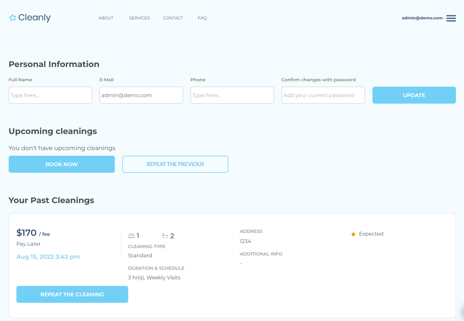 This page display customers’ personal information, as well as upcoming and past cleanings.