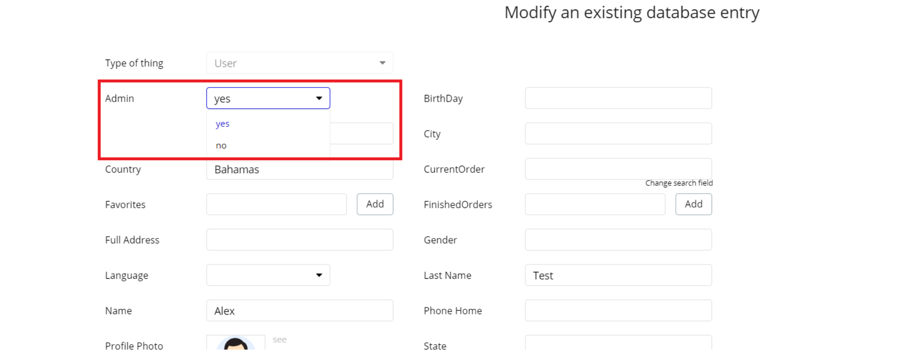 Admin within the User datatype to yes. After you do that, this user will have a menu option called admin in the drop menu that reveals itself if you click the avatar in the header. If a non-admin user accesses the admin page, he will not be able to do any manipulations because of the condition on page load that sends this user to index if the field