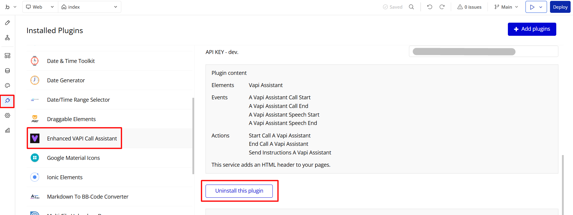 - Remove the Enhanced VAPI Call Assistant plugin from the plugin tab.